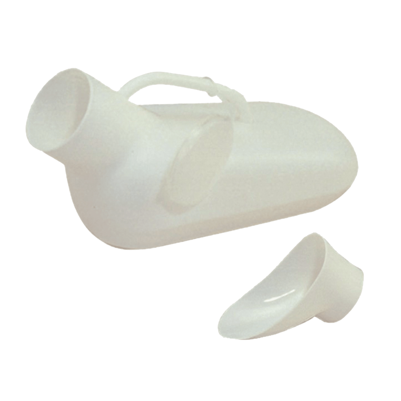 Los Urinarios están hechos de plástico resistente y cuentan con un cuello largo y una tapa a presión para ayudar a evitar derrames, los Urinarios se pueden usar tanto de pie como acostado.