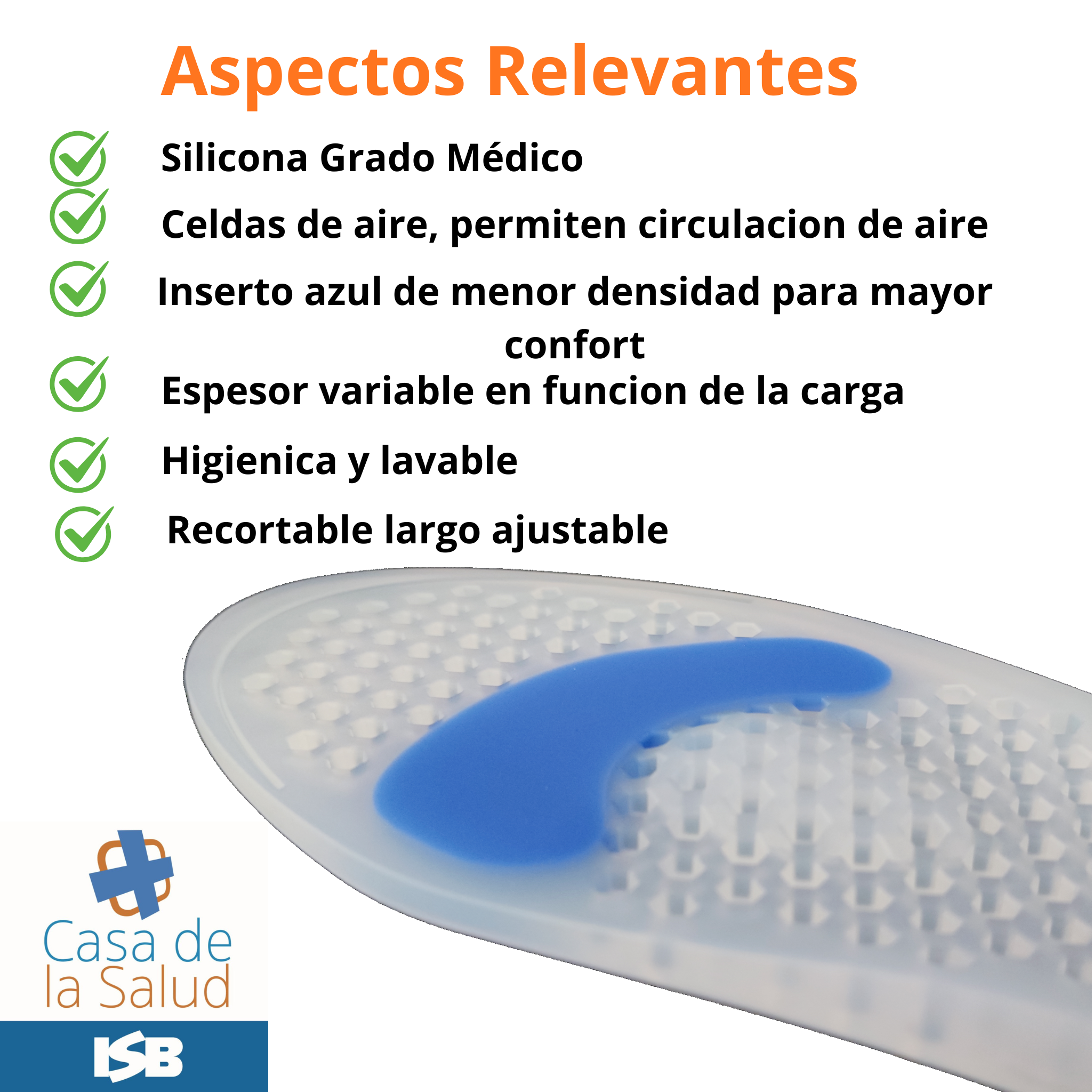 Plantillas enteras de silicona, con celdas que mejoran la ventilación y facilitan su colocación , proveen un apropiado equilibrio en la absorción de impactos y retorno de energía sobra la zona plantar en su totalidad.